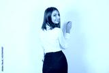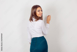writing beautiful brunette woman with back side turning to you camera smiling.