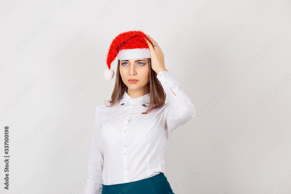 worried stressed overwhelmed young woman wearing red santa claus hat, looking up