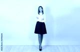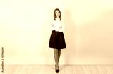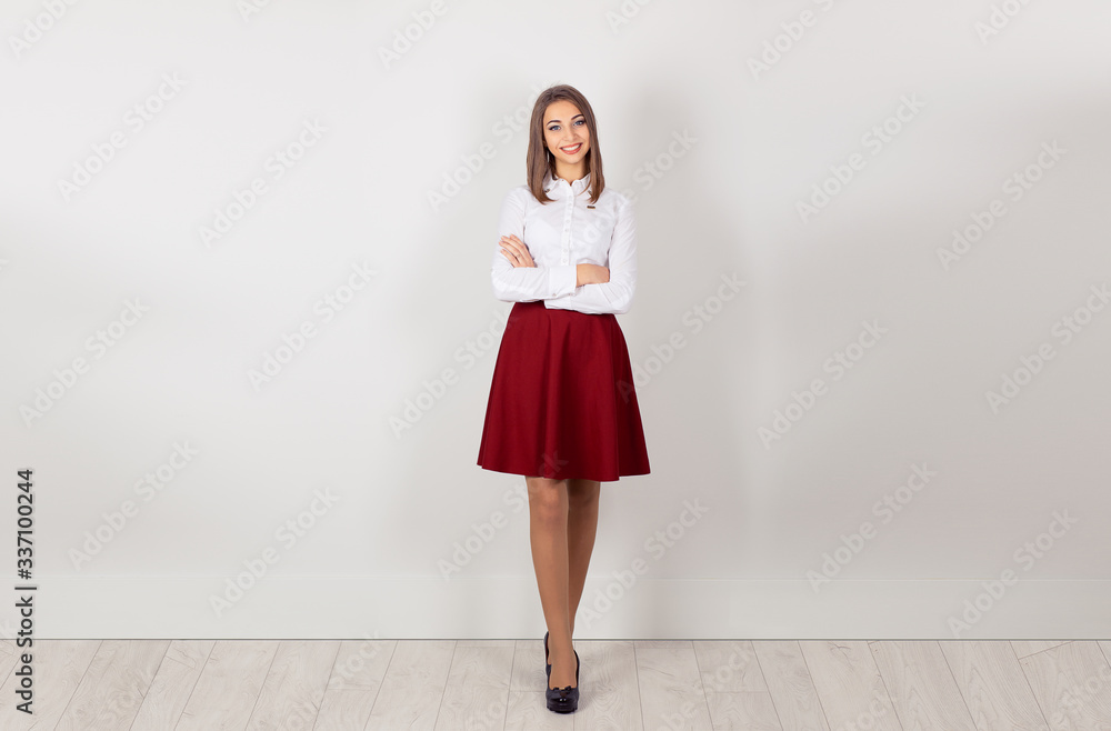 Successful and bold. Full length of happy young businesswoman with crossed arms, standing isolated against white wall. One single person. White shirt, red skirt. Copy space.