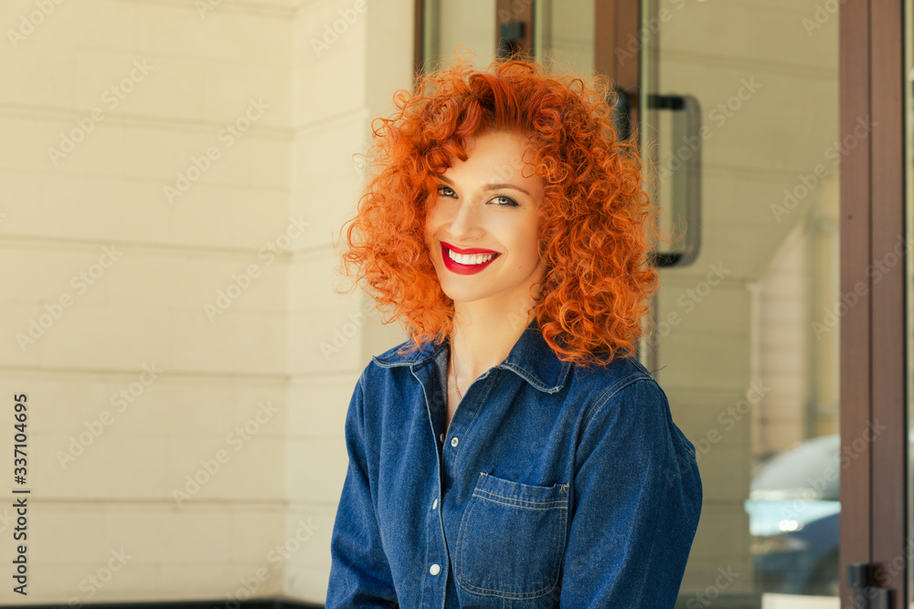 Close-up portrait of a happy beautiful red-headed girl. Wonderful smiling woman with lovely look bright make up. Natural young beauty. horizontal shot. outdoors near office, building apartment street