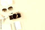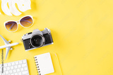 Retro film camera, sunglasses, note book, airplane, keyboard and hat on yellow pastel background for travel summer holiday and vacation concept.