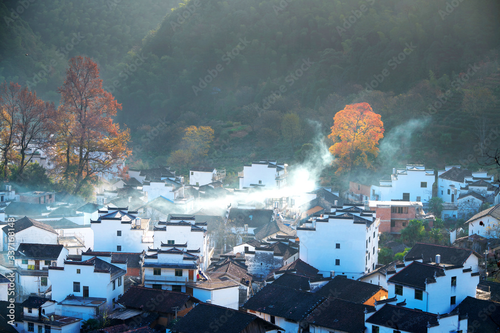 The morning fog on the dwellings of Anhui buildings in Wuyuan county Jiangxi province, China.