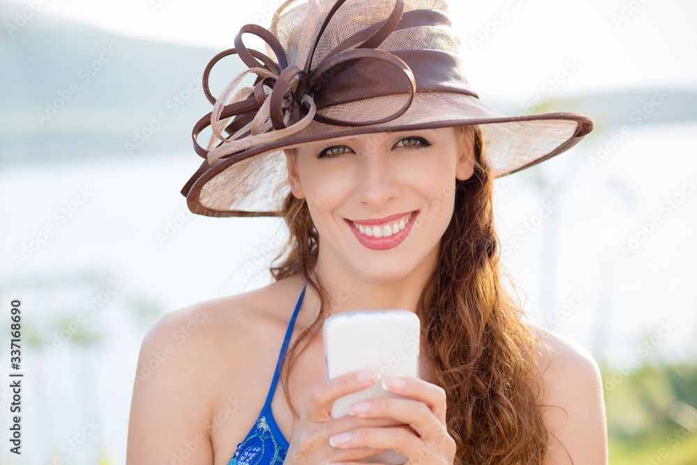 Smiling beautiful woman in hat with smartphone looking at camera outdoor, summer park sea lake background, leisure time, positive human emotion face expression, horizontal image