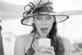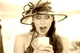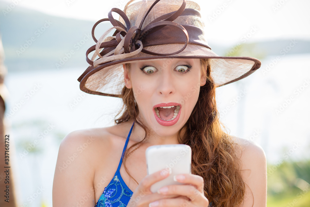 Closeup portrait surprised screaming young girl in hat looking at phone seeing news or photos with funny emotion on her face isolated outside city background. Human emotion, reaction, expression