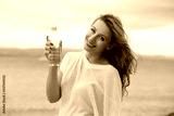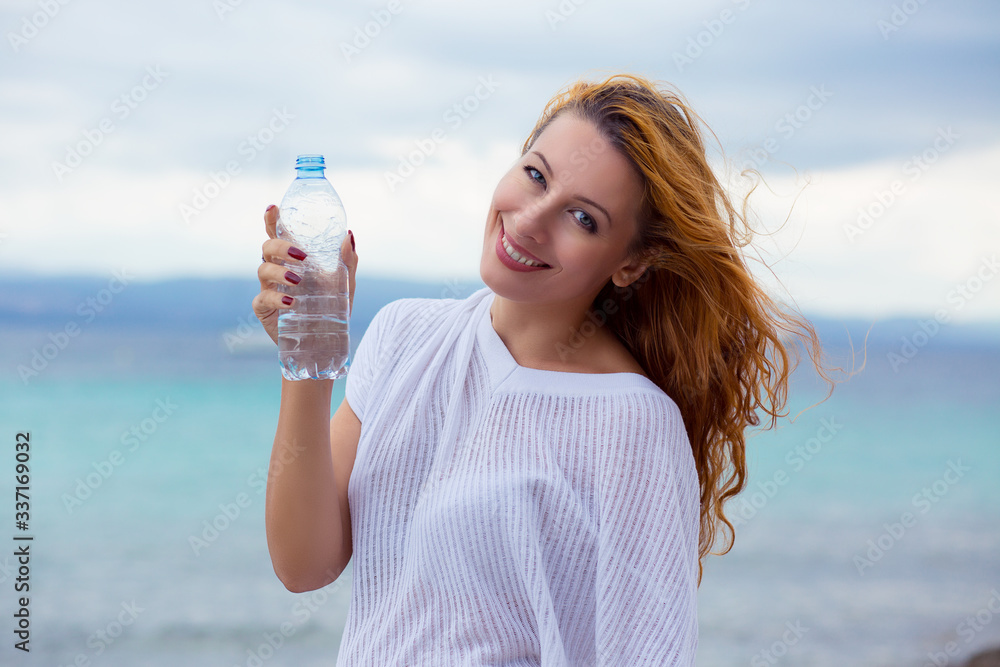 Beautiful young brunette woman drinking water and cooling off after running at the beach on a sea background