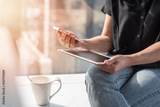 Digital lifestyle blog writer at home or business person using smart device working on internet communication technology, reading e-book, paying online banking e-commerce payment