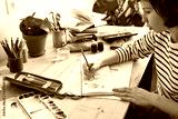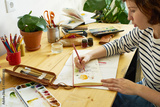 Close-up image of artist drawing in a sketchbook. Female designer working from home. Creative cozy workplace