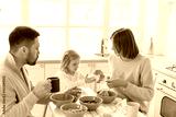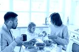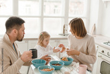 Young cute family with little daughter have breakfast at home in the kitchen.