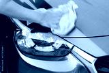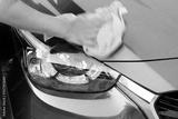 Hand polishing car with microfiber cloth. Man cleans car with cloths.