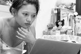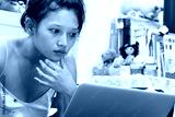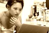 The pensive woman at nightgear is looking into laptop screen. Portrait of Asian girl when working at home with computer. Home office.