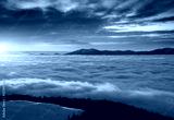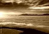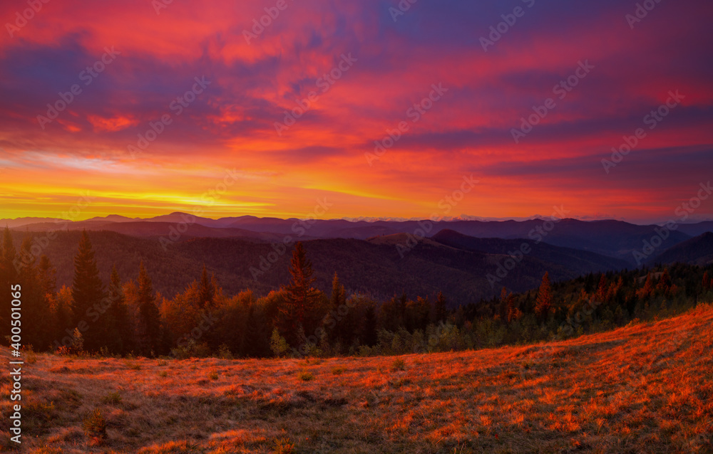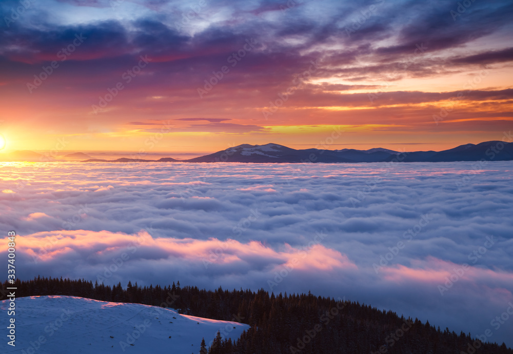Fantastic air view of the valley covered with dense fog. Location Carpathian mountain, Ukraine, Europe.