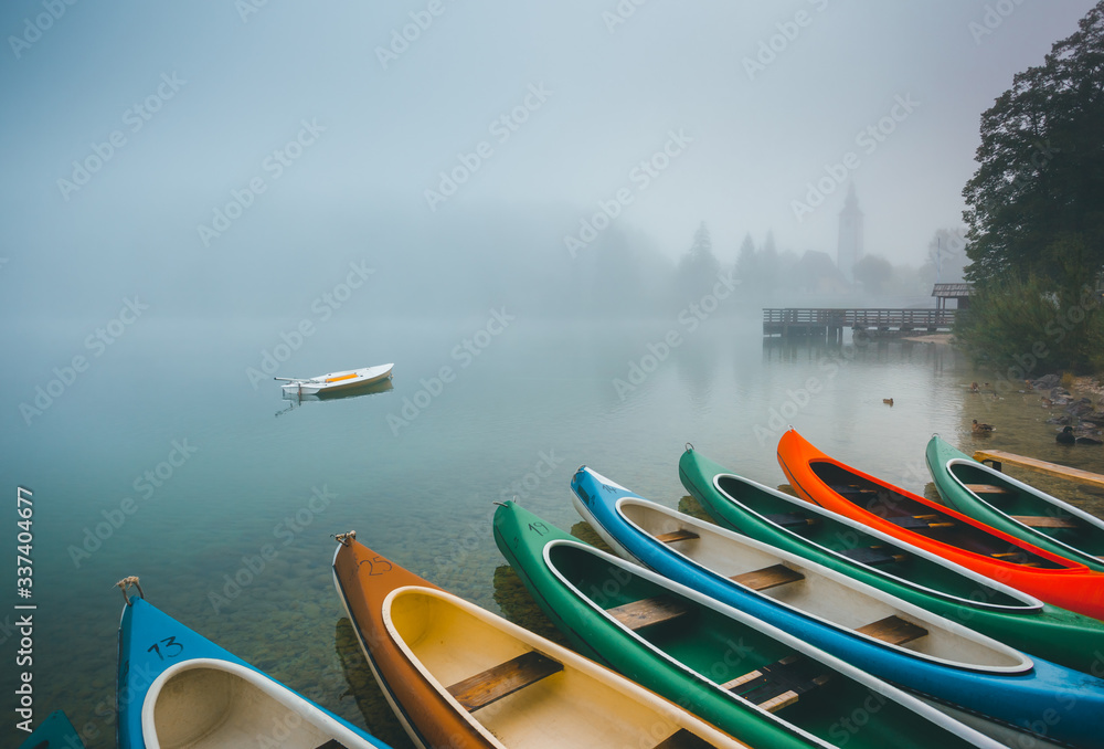Great view of the Bohinj lake in foggy morning. Location place Triglav national park, Slovenia.