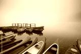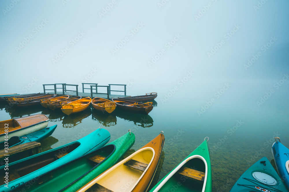Great view of the Bohinj lake in foggy morning. Location place Triglav national park, Slovenia.