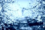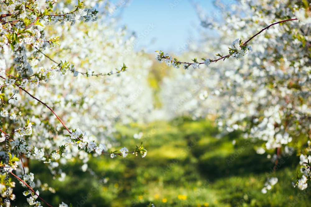 Bright ornamental garden with blooming trees on a sunny day.