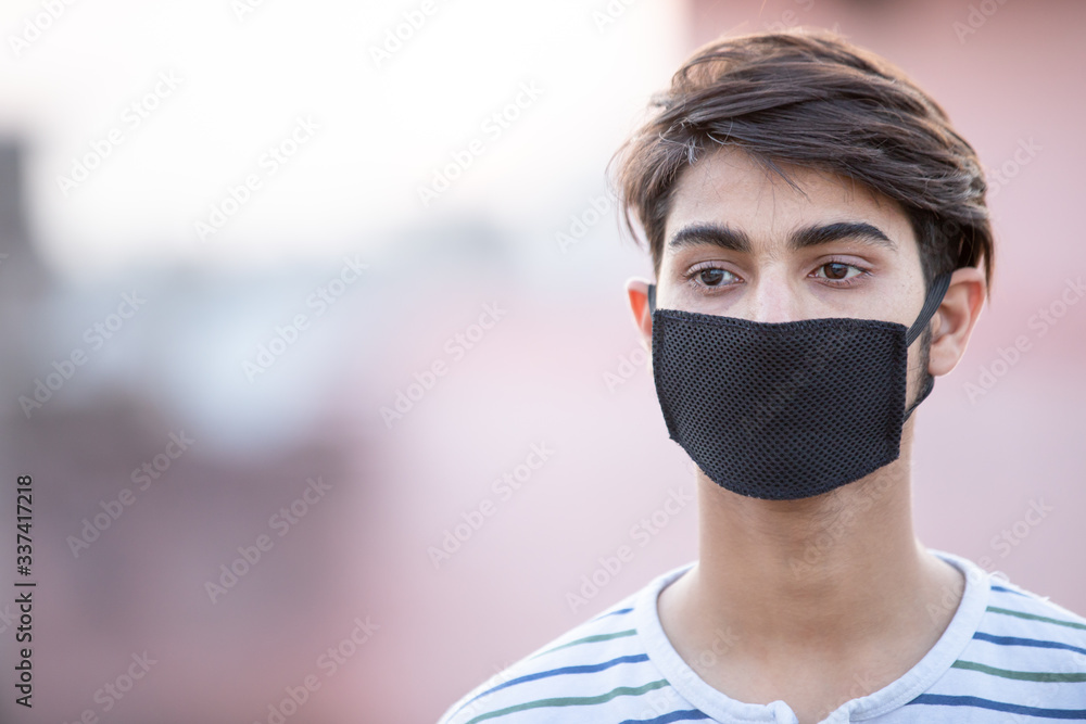 A teenage boy in a medical mask at home during covid Home Lock down .