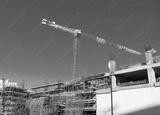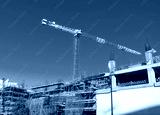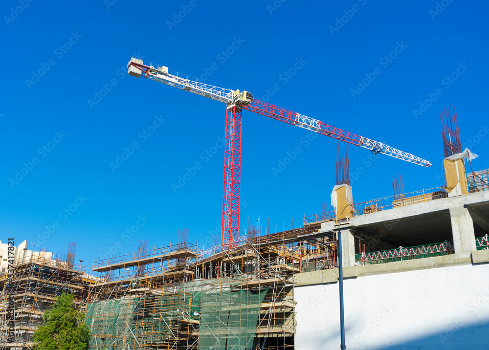 Single high-rise construction crane on the blue sky background. Building construction site with crane.
