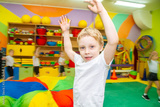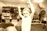 A boy trains in the gym in kindergarten. Lesson a group of kids at the hotel.