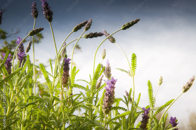 zdjęcie przedstawiające lawendę i pomarańcz na gałązce rosnącą w ogrodzie w górach Hiszpanii w słońcu wiosną