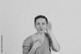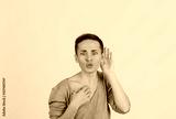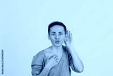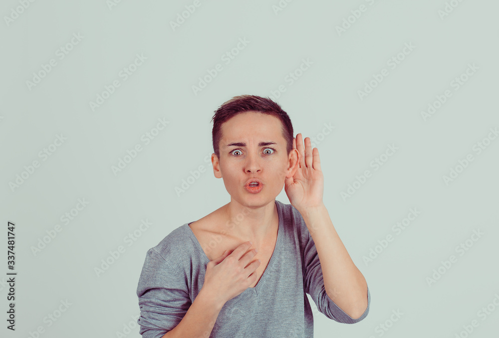 Closeup nosy teenager girl hand to ear gesture carefully intently secretly listening in on juicy gossip conversation news privacy violation isolated light green grey background. Human face expression