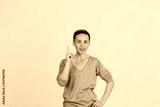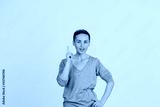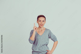 Portrait happy beautiful woman thinking looking up pointing with finger at blank copy space isolated light green wall background Positive human face expression emotion feeling body language perception
