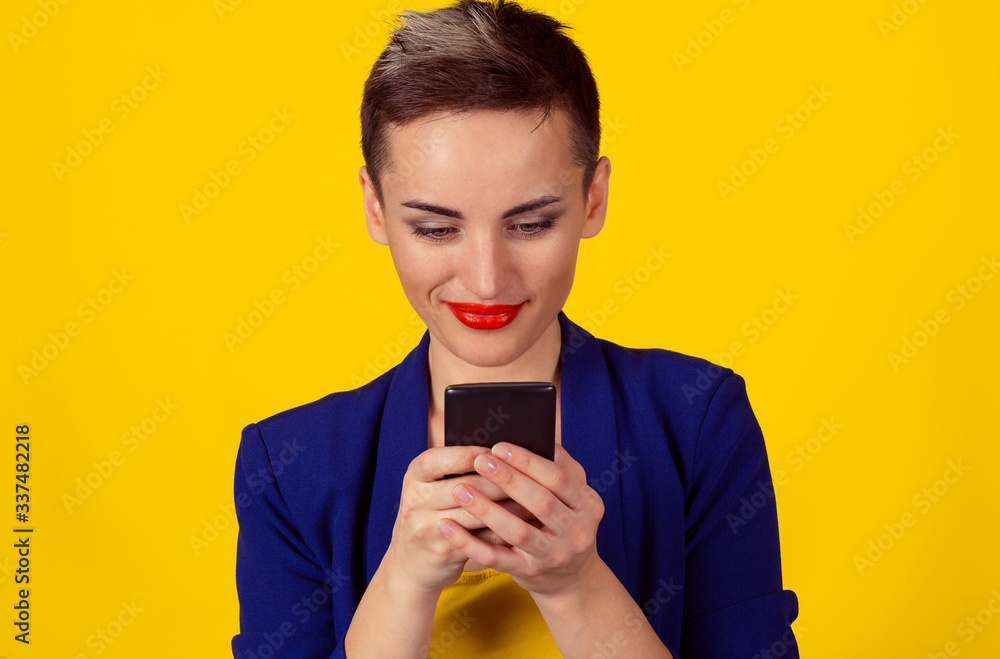 Portrait of young happy business woman texting on smart phone isolated yellow background wall