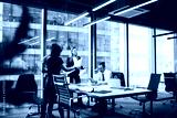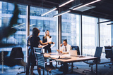 Cooperation process of professional male and female partners, successful corporate colleagues analyzing information from paper documents during working time in conference room with desktop