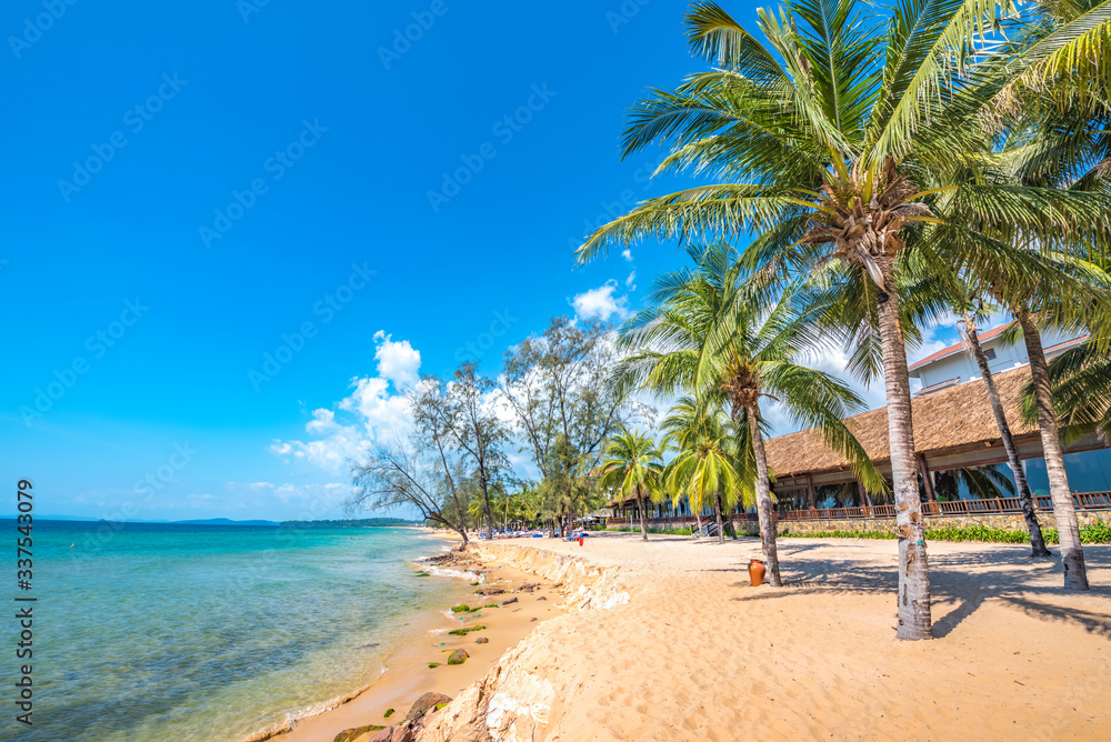 Coastal Scenery of The Long Beach on Phu Quoc Island, Vietnam, a Popular Tourism Destination for Summer Vacation in Southeast Asia, with Tropical Climate and Beautiful Landscape.