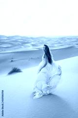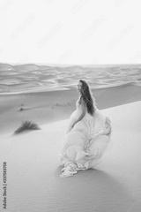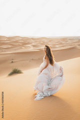 Portrait of bride woman in amazing wedding dress in Sahara desert, Morocco. Warm evening light, beautiful pastel tone, sand dunes on horizon.