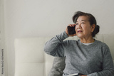 Happy Asian senior woman talking a phone and holding drink cup, stay home stay safe concept.