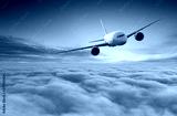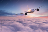 Commercial airplane jetliner flying above dramatic clouds in beautiful light. Travel concept.