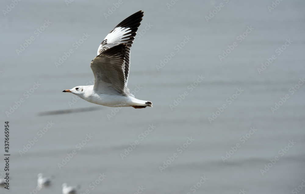 Seagulls flying over the sea. Pier on background