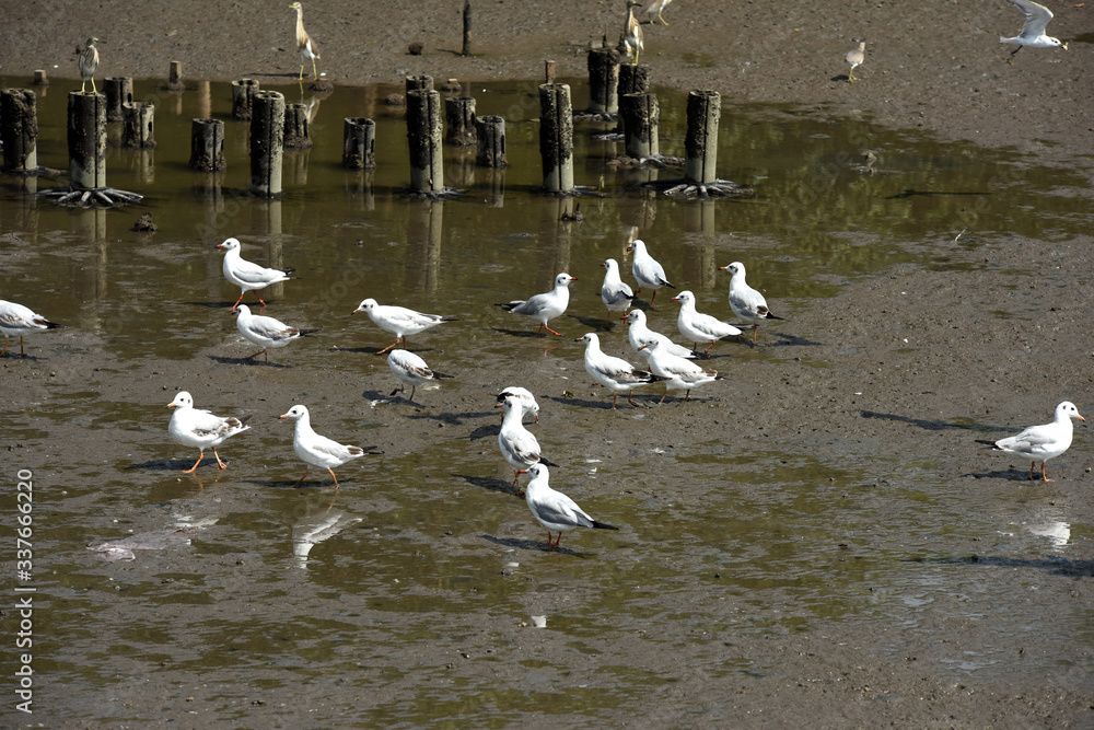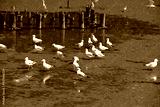 Seagulls flying over the sea. Pier on background