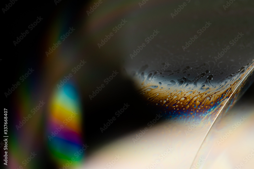 Psychedelic abstract planet from soap bubble, Light refraction on a soap bubble, Macro Close Up in soap bubble. Rainbow colors on a black background. Model of Space or planets universe cosmic galaxy.