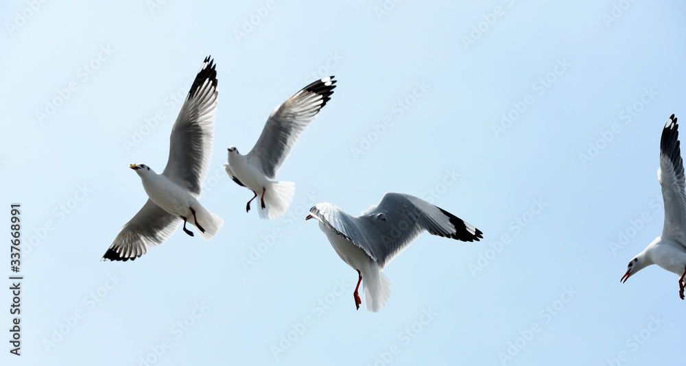 Seagulls flying in blue sky