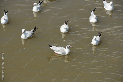 Seagulls flying over the sea. Pier on background