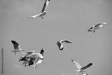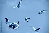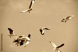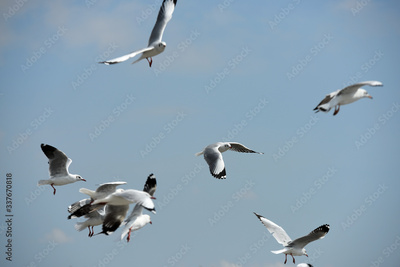 Seagulls flying over the sea. Pier on background