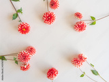 Directly above view of red and white dahlias arranged on table with copy space (selective focus)