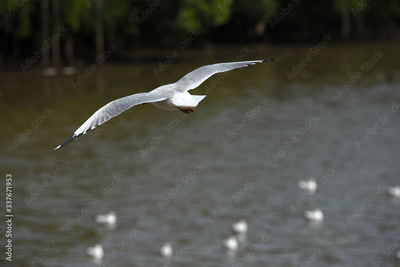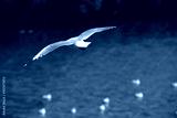 Seagulls flying over the sea. Pier on background