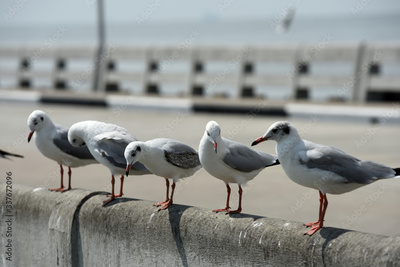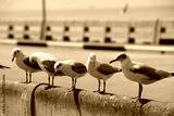 Seagulls flying over the sea. Pier on background