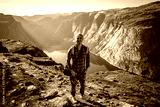 A smiling man is hiking the mountains with a backpack
