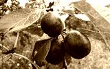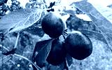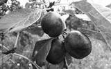 Three ripe plums on a branch.