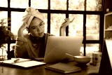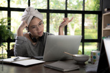 Asian young woman in casual clothing using laptop and smiling while working from home.