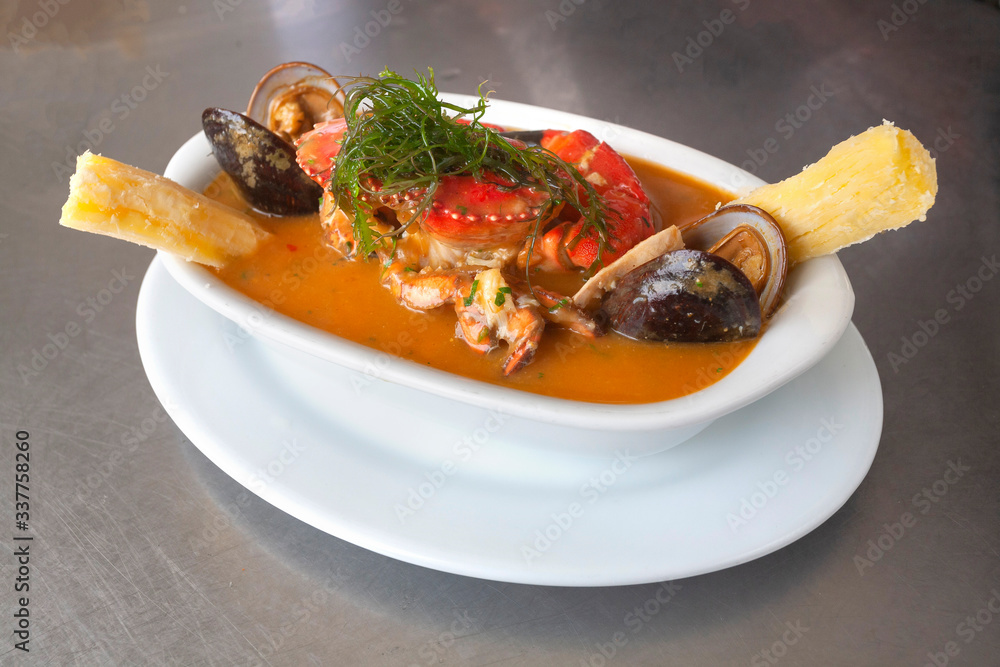 Peruvian seafood: Parihuela or special seafood soup with crab, mussels and cassava, decorated with seaweed and served on a white bowl
