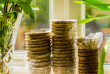 biodegradable seed pots stacked next to window ready for new season gardening