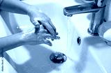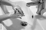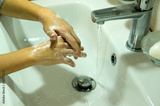 The boy thoroughly washes his hands with soap. Outside COVID 19