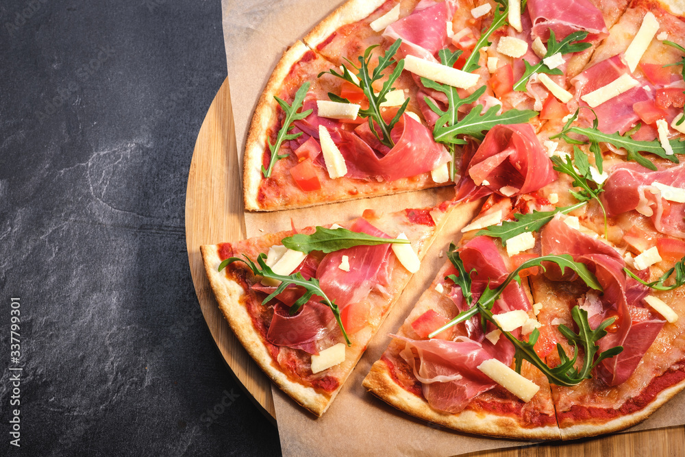 Pizza on wooden board on black stone background. Italian traditional food. Delicious pizza with serrano jamon, parmigiano-reggiano cheese and rucola. Restaurant menu. Copy space, top view
