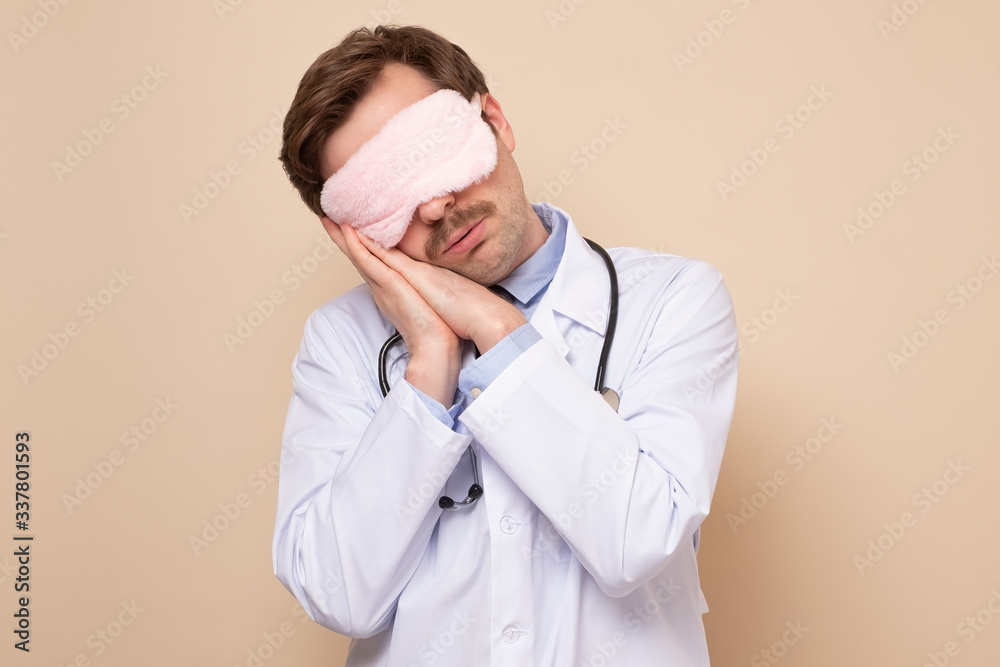 Young caucasian male doctor with sleeping mask on eyes resting having a nap.