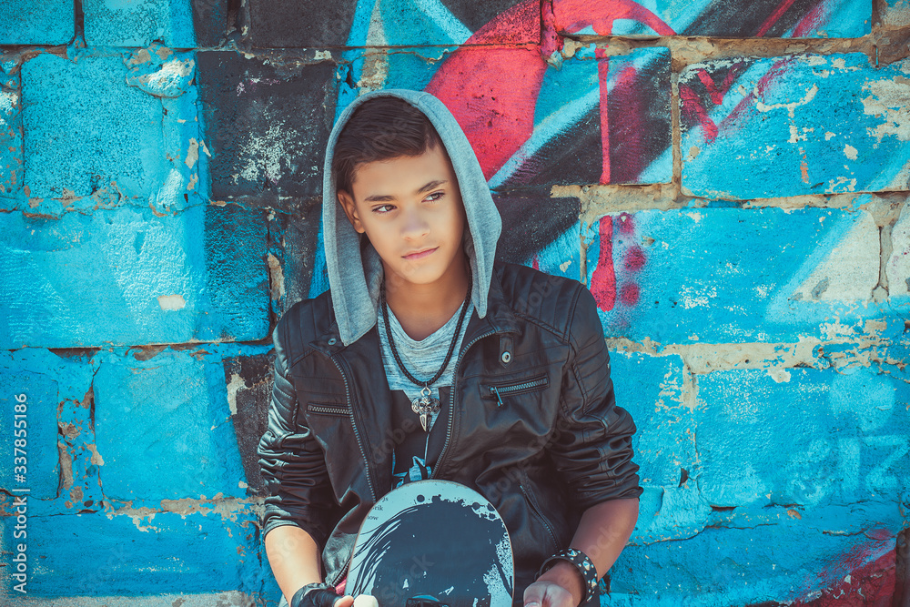 Portrait of a young handsome italian boy with skate and hood posing in the city urban graffiti background looking sidewards