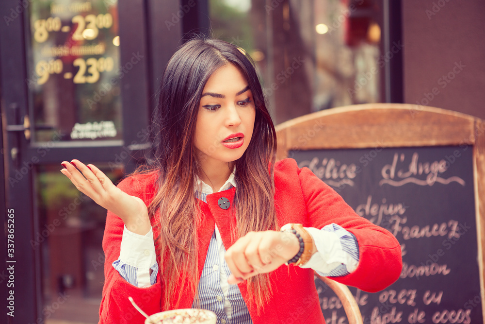 Portrait of shocked young woman holding hand with wrist watch and looking at camera isolated on coffee shop outside terrace background