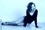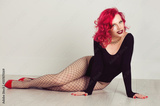 red head woman with long legs red lips and high heels and black body lying down